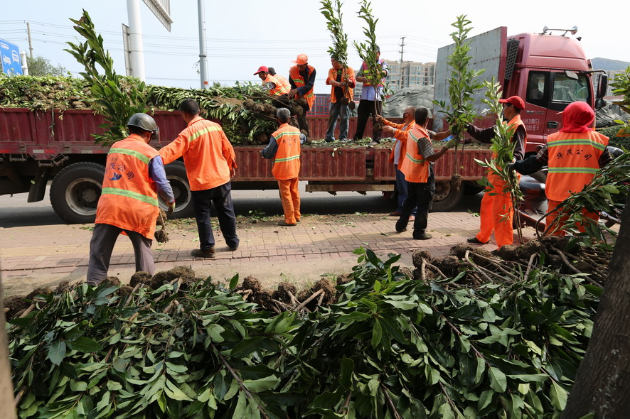 新光路鐵路橋至港城大道段南側(cè)綠化帶,因?yàn)槿藶椴忍?、車輛碾壓導(dǎo)致綠化斑禿損壞嚴(yán)重,為盡快恢復(fù)綠化原貌,改善市容市貌。8月18日,裕升、裕欣養(yǎng)護(hù)公司組織80多名綠化工,從早上6點(diǎn)一直干到下午6點(diǎn),卸苗、運(yùn)苗、挖坑、插苗,烈日酷暑下奮戰(zhàn)一整天,中午在樹陰下吃點(diǎn)盒飯,喝點(diǎn)礦泉水,繼續(xù)工作,橘黃色工作被汗水浸透、被烈日烤干,這樣有好幾個(gè)來回?!敖裉煳覀円谶@片綠化補(bǔ)植紅葉石楠、金森女貞等模紋小苗1萬余株,紅葉石楠球等灌木110株,有效改善該路段綠化植被,提升城市形象,我們還要在黃海續(xù)道補(bǔ)植草坪近30000平方,在這條1000多米長的路段,有車輛維修點(diǎn)50多家,車輛出入,對路邊綠化帶傷害非常大,這一路段也是環(huán)衛(wèi)整治長期存在的‘老大難’,這次,在開發(fā)區(qū)行政執(zhí)法部門的配合下,我們要重新種植草坪,對這一‘老大難’路段植被進(jìn)行恢復(fù),另外德蘭南路、東路補(bǔ)植苗木近80萬元的綠化工程也已開工上土整土,接著要栽苗,根據(jù)開發(fā)區(qū)創(chuàng)衛(wèi)部署要求,上述這些事情必須在8月底完成,所以說時(shí)間相當(dāng)緊,職工們都冒著高溫,加班加點(diǎn)搶進(jìn)度。”公司副總經(jīng)理郁宏峰說。