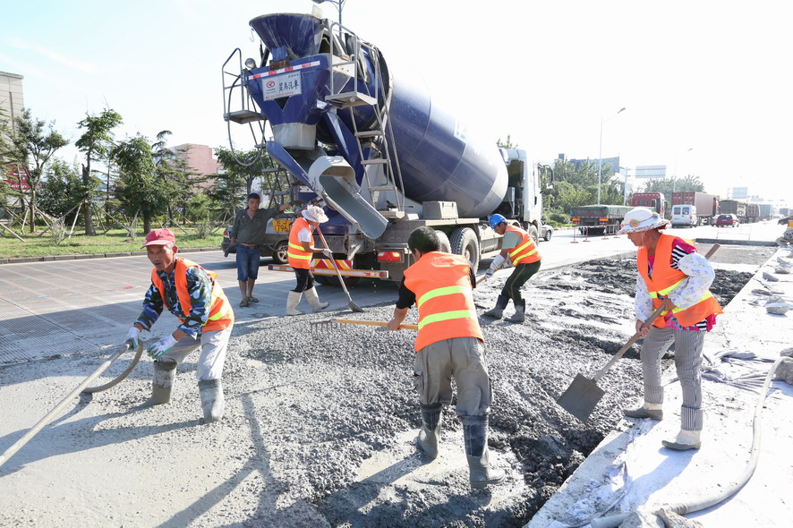 在大港路“新光路至零公里”路段,筆者在水泥路上看到一塊塊被切割成方方正正的凹面,四周都架好防護(hù)欄等安全防護(hù)設(shè)施,在華東城北門偏東不遠(yuǎn)處,一臺挖掘機(jī)的鏟斗被換上沖擊破碎錘,正在一大塊破損的水泥路面沖擊破碎作業(yè),“嗒嗒嗒”的沖擊聲十分震耳。在與現(xiàn)場作業(yè)的盛達(dá)市政公司市政維修項(xiàng)目部副主任史如勤交流中得知,該路段是附近集團(tuán)箱基站進(jìn)出港口集裝箱車輛的重要通道,每天有好幾百輛集裝箱車輛進(jìn)出,水泥路面不堪重負(fù),損壞比較嚴(yán)重,根據(jù)開發(fā)區(qū)創(chuàng)衛(wèi)工作要求,由他們對該路段破損處進(jìn)行局面分割維修,整個(gè)路段維修面積達(dá)到5000多平方,為保證道路使用通行,采取半幅維修、邊破碎邊澆灌的方式,保證施工進(jìn)度,現(xiàn)正在維修北側(cè)路面,整個(gè)路面維修計(jì)劃在8月底完成?!耙?yàn)閯?chuàng)衛(wèi),我們下一步還要對轄區(qū)內(nèi)的破損、歪到的路牙石進(jìn)行維修扶正,242路段瀝青破損路面維護(hù),還要開通四處道口,而現(xiàn)在事多人少,人手比較緊張,我們周六周日都沒有休息,就是想把創(chuàng)衛(wèi)工作任務(wù)一項(xiàng)一項(xiàng)地及時(shí)完成,決不能拖創(chuàng)衛(wèi)工作后腿?!彼呎f邊用肩上的毛巾擦著額頭上的汗水。
