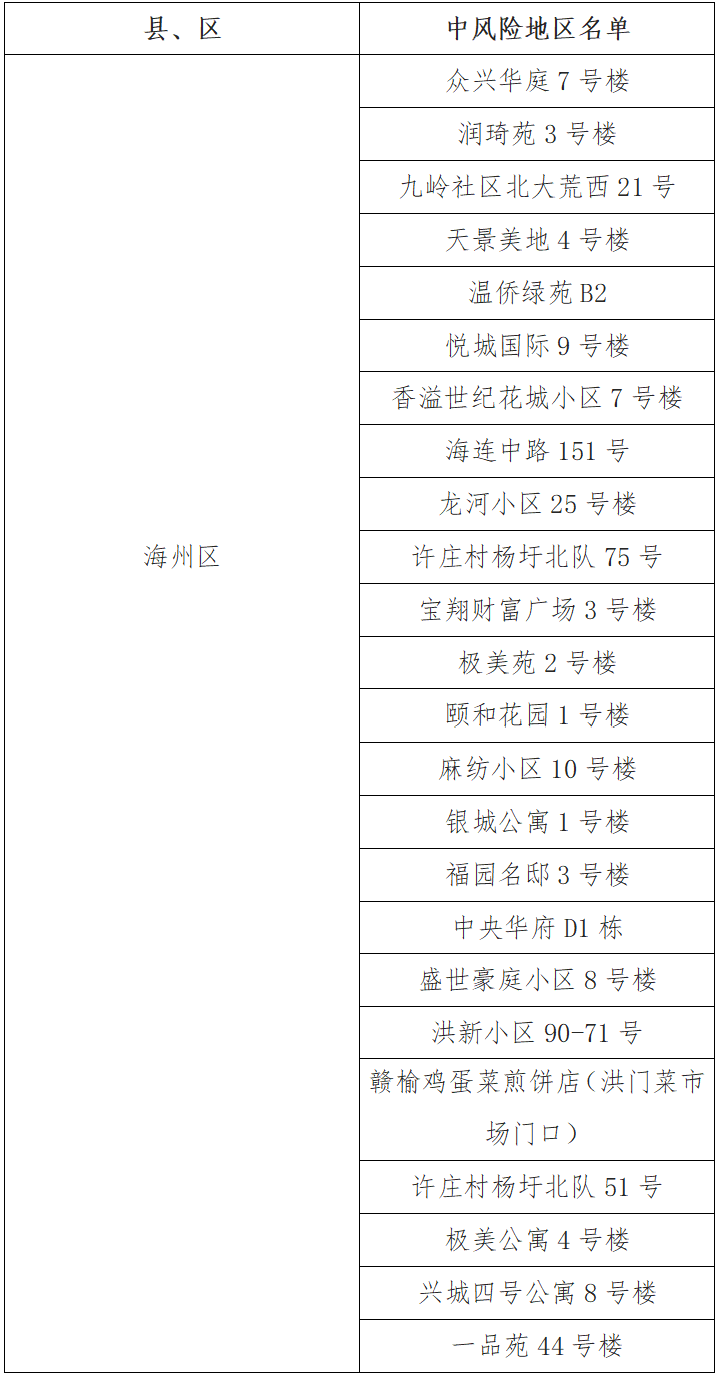 根據(jù)國務(wù)院聯(lián)防聯(lián)控機(jī)制有關(guān)規(guī)定,經(jīng)綜合評估研判,市指揮部決定,自發(fā)布之日起,將頤和花園1號樓、麻紡小區(qū)10號樓、銀城公寓1號樓、福園名邸3號樓、中央華府D1棟、盛世豪庭小區(qū)8號樓、洪新小區(qū)90-71號、贛榆雞蛋菜煎餅店(洪門菜市場門口)、許莊村楊圩北隊51號、極美公寓4號樓、興城四號公寓8號樓、一品苑44號樓調(diào)整為中風(fēng)險地區(qū)。其他地區(qū)風(fēng)險等級不變。調(diào)整后全市現(xiàn)有24個中風(fēng)險地區(qū)。