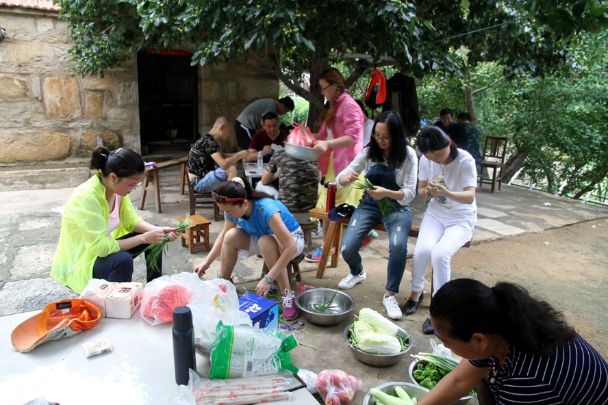 這處清幽潔凈的農(nóng)家小院成了隊員大展廚藝的用武之地,大家迅速整理好自帶的蔬菜食物,按各自特長分好工。有清理蔬菜的、有和面的、有刷鍋燒水的,那些實在幫不上忙的便湊到一起圍坐在院中的樹蔭下開始“摜蛋”比賽。廚房中,面對農(nóng)戶家中的那兩口大草鍋,負(fù)責(zé)炒菜的隊員直撓頭,因為在城里實在是無處尋覓這樣的鍋灶了,更不知該如何才能把這灶火燒得旺旺的。這時我們的女隊員劉惠自告奮勇,勇敢地?fù)?dān)起了“伙頭軍”的重任。還別說,在經(jīng)過戶主老大爺?shù)囊环更c后,一會兒功夫這灶火便被她燒得有規(guī)有距起來。很快,灶房便飄出了炒肉、煎蛋的香味。此時,院中也已擺起了包旱餃的陣式來了。面已和好,兩種口味的餡料也已備好。有負(fù)責(zé)搟餃子皮的,有負(fù)責(zé)包餃子的,隊員們賽速度、賽質(zhì)量,兩種口味的餃子被分別擺放在各自的簸箕里。看著形態(tài)各異的餃子,大家忍不住評價起來,最終有隊員被冠上了“專業(yè)面點師”的雅號。人多力量大,當(dāng)所有的菜肴、面點擺到長桌上時,大家開心不已,雖然這算不上美味佳肴,但自己的勞動果實卻總是最美味。