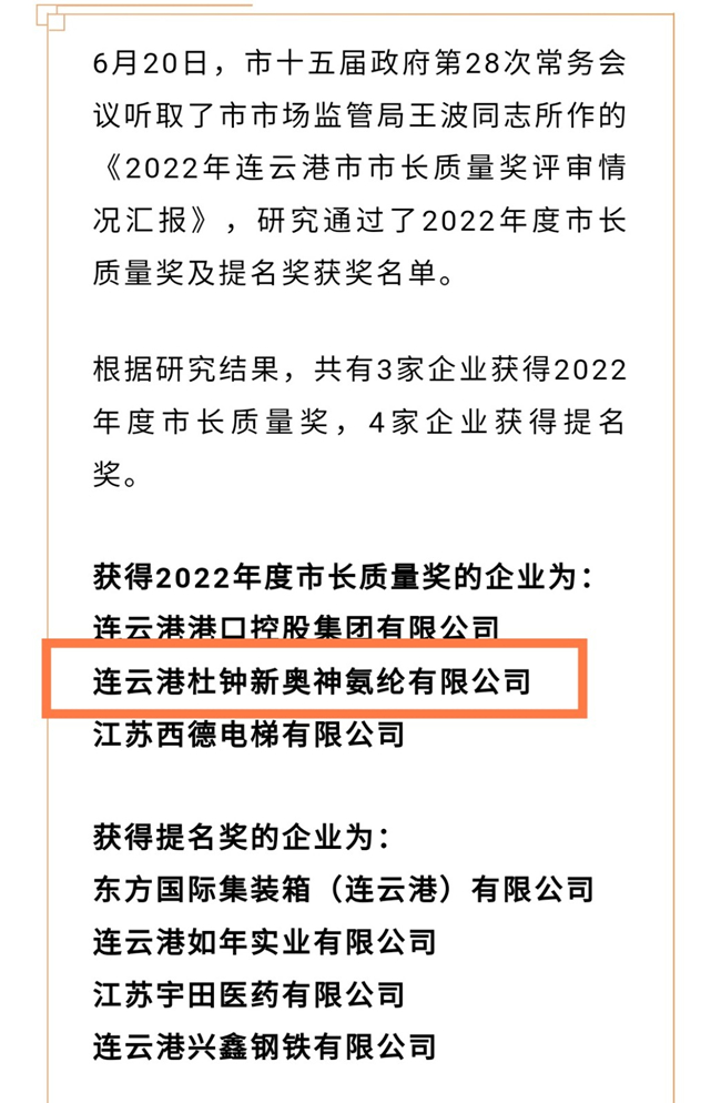 經(jīng)過自愿申報(bào)、資格審查、資料評(píng)審、現(xiàn)場(chǎng)評(píng)審、綜合評(píng)價(jià)審定公示和政府研究品準(zhǔn)共7個(gè)環(huán)節(jié),最終6月20日,連云港市市物價(jià)局政府第28次常務(wù)會(huì)議聽取了連云港市市場(chǎng)監(jiān)督局王波所做的《2022年連云港市市長質(zhì)量獎(jiǎng)評(píng)審情況匯報(bào)》,研究通過了2022年度市場(chǎng)質(zhì)量獎(jiǎng)和提名獎(jiǎng)的名單,確定了3家企業(yè)獲得2022年度市長質(zhì)量獎(jiǎng)、4家企業(yè)獲得提名獎(jiǎng),我公司榮獲2022年度市長質(zhì)量獎(jiǎng)。