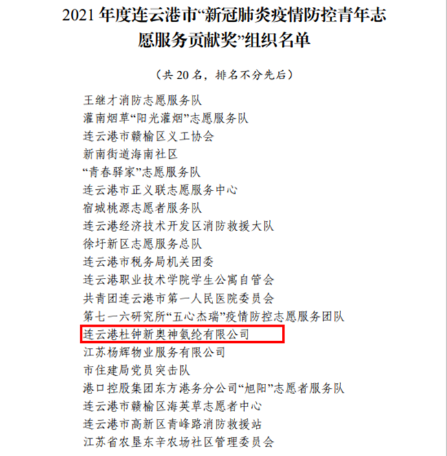 近日,共青團(tuán)連云港市委員會(huì)公布2021年度全市青年志愿者行動(dòng)暨新冠肺炎疫情防控青年志愿服務(wù)貢獻(xiàn)獎(jiǎng)評(píng)選表彰結(jié)果,連云港杜鐘新奧神氨綸有限公司志愿者服務(wù)隊(duì)榜上有名,榮獲2021年度連云港市“新冠肺炎疫情防控青年志愿服務(wù)貢獻(xiàn)獎(jiǎng)”組織榮譽(yù)稱號(hào)