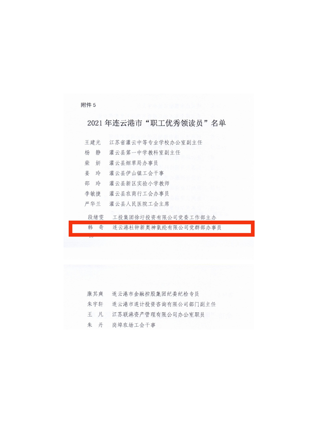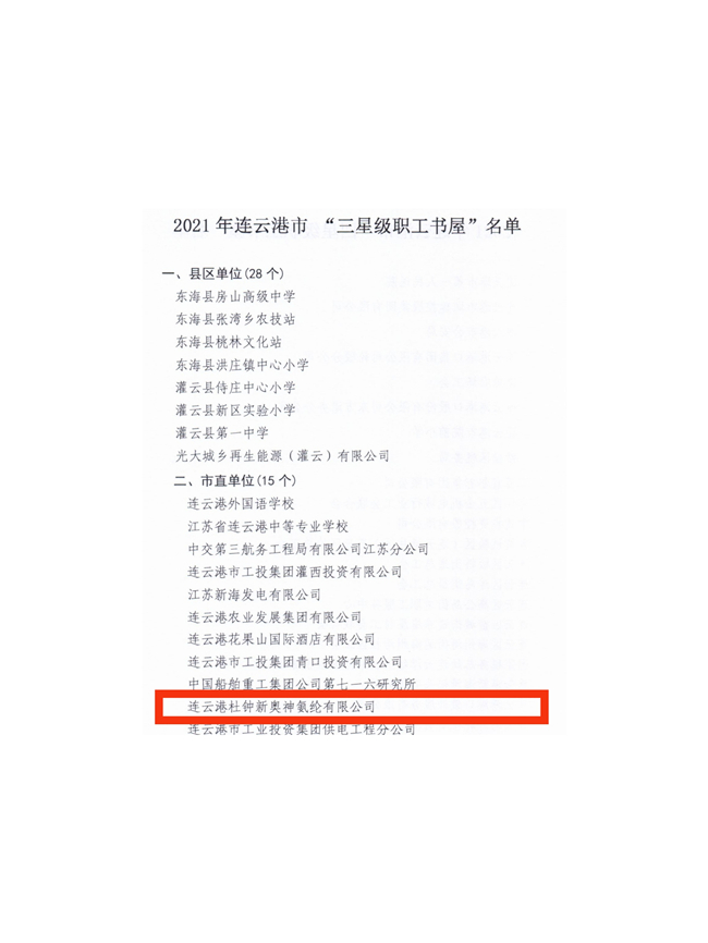 日前,連云港市總工會(huì)下發(fā)的《關(guān)于2021年連云港市“星級(jí)職工書屋”、職工優(yōu)秀領(lǐng)讀員情況通報(bào)》,杜鐘氨綸公司獲評(píng)2021年度連云港市“三星級(jí)職工書屋”、韓奇獲評(píng)2021年連云港市“職工優(yōu)秀領(lǐng)讀員”,標(biāo)志著公司職工書屋建設(shè)再上新臺(tái)階。