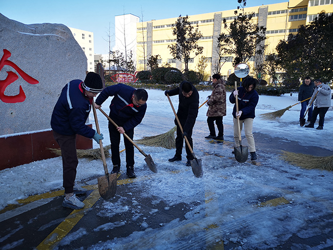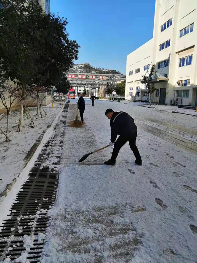 12月29日,港城迎來了2020年的第一場雪。白雪皚皚,北風(fēng)呼嘯,廠區(qū)各個生產(chǎn)設(shè)施道路上都覆蓋上了厚厚的積雪。雖是一片銀裝素裹的美景,卻給廠內(nèi)廣大職工的出行工作造成極大不便。為了保障公司安全穩(wěn)定生產(chǎn)和員工出行道路安全,杜鐘氨綸公司黨委迅速組織開展了清除積雪大掃除活動。