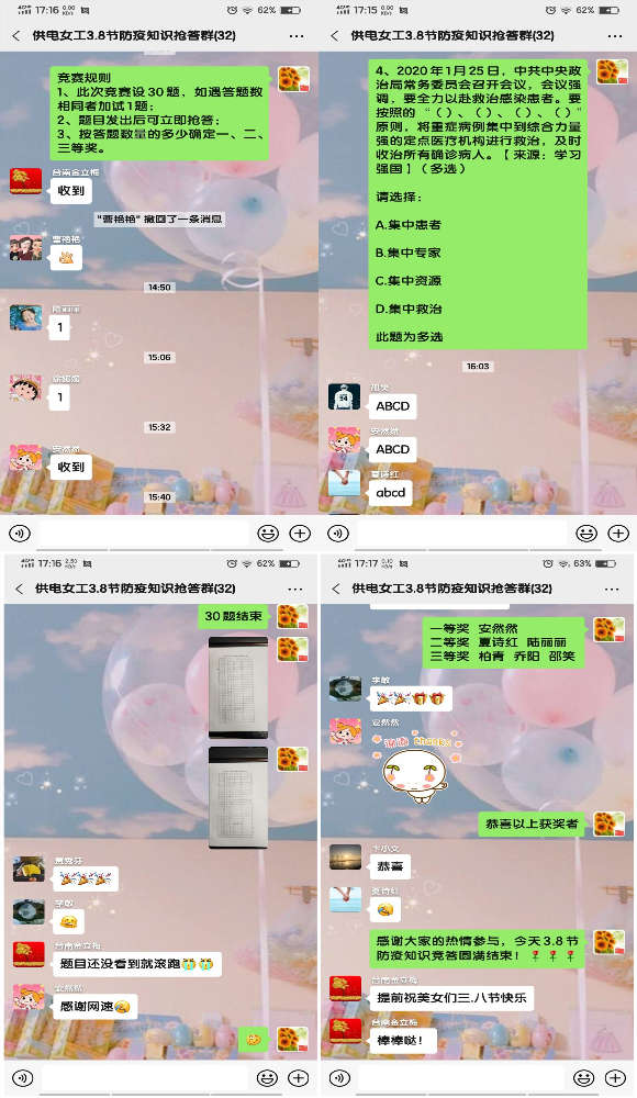值此2020年第110個國際“三八”婦女節(jié)來臨之際,為了讓公司女職工在做好自身疫情防護(hù)的前提下,能夠度過一個健康、愉快、充實的節(jié)日,公司女工委利用微信群組織全體女職工開展了慶“三八”抗新冠疫情防護(hù)知識搶答賽活動。