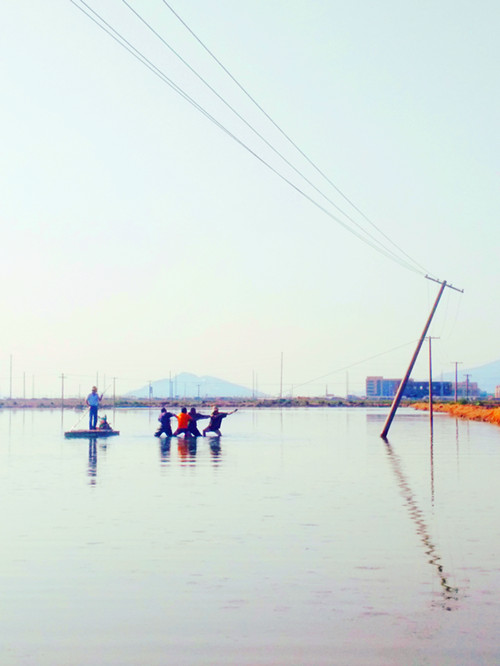 9月20日,該所組織人員進行搶修。搶修人員經(jīng)過現(xiàn)場勘查后,發(fā)現(xiàn)隱患地點處于池塘中,搶修車輛等大型工器具無法到達,只能靠人工搶修。在與魚塘養(yǎng)殖戶協(xié)商后,俞德春、楊祖加、楊新軍等搶修人員在對低壓線路采取停電、驗電、掛接地等安全措施后,利用小木船來回穿梭、傳送材料,再跳入沒腿深的水里,將電桿扶正、加固。此時,水面上的船、水中的人、拖拽的線路成了鏡頭中的新聞亮點。最后在經(jīng)過半個多小時的特色搶修后,成功恢復(fù)供電。(錢明華)