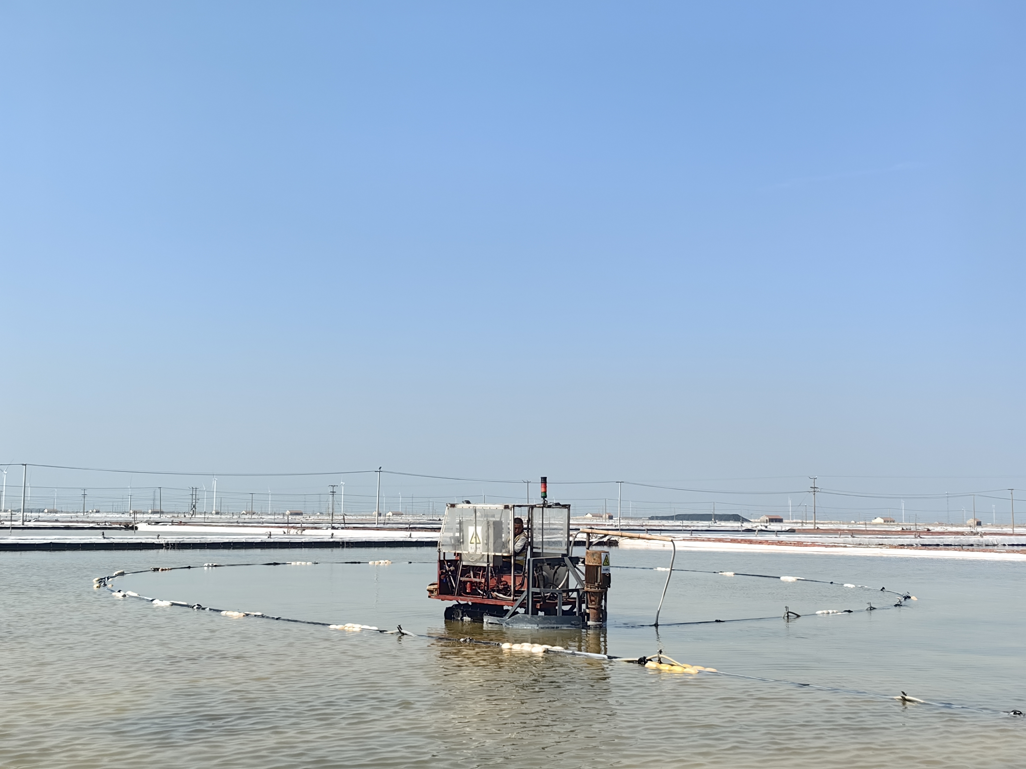 在八班扒鹽現(xiàn)場,一臺唐三零扒鹽機(jī)正在鹽池里進(jìn)行扒鹽作業(yè),唐三零操作手駕駛著機(jī)械,在鹽田中央緩緩行進(jìn)著,不時(shí)的回頭觀察鹽泵吸鹽情況,確保扒鹽管道順暢。遠(yuǎn)處的廩基內(nèi),大廩工正在熟練地利用分流板對鹽篩中傾瀉下的原鹽進(jìn)行引導(dǎo)分流,熟練地打好廩墻。