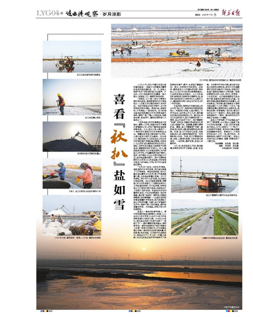 扒鹽現(xiàn)場(chǎng),指揮生產(chǎn)的程龍是土生土長(zhǎng)的“鹽三代”,爸爸和爺爺都是老鹽場(chǎng)人。“和鹽場(chǎng)打交道,心里才踏實(shí)。”大學(xué)畢業(yè)后,在外地工作了幾年,程龍最終還是決定回到鹽場(chǎng)工作。程龍說(shuō),純手工扒鹽的年代,鹽工們都很辛苦——春季,鹽工們迎來(lái)“大忙”。他們需要防“地漏”,用石拱、壓割機(jī)把池底壓實(shí),防止鹵水滲透下去。緊接著,就要忙春季扒鹽。夏季,鹽工們需要防“天漏”,提前將鹵水放進(jìn)土塘,避免降雨將鹵水稀釋。秋季,鹽工們開(kāi)始手工扒鹽,用扁擔(dān)挑鹵水,用小推車(chē)把曬好的鹽一車(chē)車(chē)推到船上運(yùn)走。冬季,鹽工們需要對(duì)溝道、池埝、土塘進(jìn)行修復(fù),為來(lái)年春天做準(zhǔn)備。一年四季,循環(huán)往復(fù),鹽場(chǎng)人辛勤勞作。