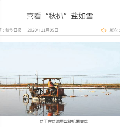 “今天這個(gè)鹽池,正好扒的海鹽。海鹽是我們千年的傳承,我們每年保留了5萬(wàn)噸海鹽。海鹽吃起來(lái)香,因?yàn)樗然c含量在96%左右,剩下的都是微量元素,尤其是含鎂量比較高。這5萬(wàn)噸海鹽,賣(mài)價(jià)并不比礦鹽高,但這是我們淮鹽的根。我們對(duì)海鹽有感情、有需要,所以仍然保留它。”日曬制鹽新河分公司經(jīng)理安樹(shù)林,作為省勞模,他帶領(lǐng)鹽工們不斷進(jìn)行技術(shù)革新,在淮鹽生產(chǎn)上創(chuàng)造了很多成果。輕型自吸式電動(dòng)履帶扒鹽機(jī)、半自動(dòng)式管道架、電動(dòng)活碴器、唐三零“油改電”、循環(huán)纜、機(jī)械式破碴耙、自動(dòng)解繩器……正是這些聽(tīng)起來(lái)晦澀難懂的專(zhuān)有名詞,極大地減輕了鹽工們的勞動(dòng)量。創(chuàng)新,在千年淮鹽的生產(chǎn)中,起到了減少勞動(dòng)強(qiáng)度、提升鹽質(zhì)量的作用。千年淮鹽,體現(xiàn)了極大的發(fā)展韌性。