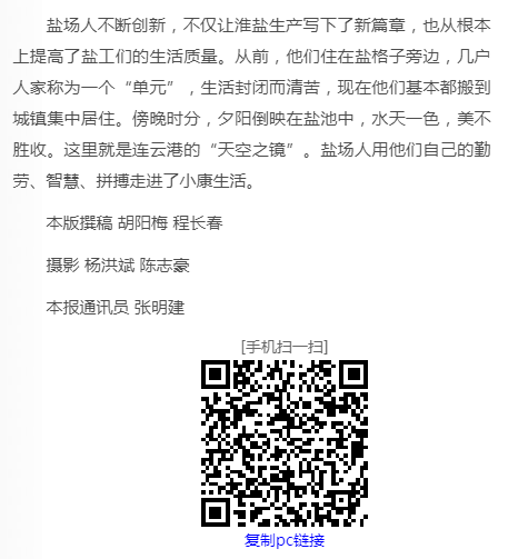 鹽場(chǎng)人不斷創(chuàng)新,不僅讓淮鹽生產(chǎn)寫(xiě)下了新篇章,也從根本上提高了鹽工們的生活質(zhì)量。從前,他們住在鹽格子旁邊,幾戶(hù)人家稱(chēng)為一個(gè)“單元”,生活封閉而清苦,現(xiàn)在他們基本都搬到城鎮(zhèn)集中居住。傍晚時(shí)分,夕陽(yáng)倒映在鹽池中,水天一色,美不勝收。這里就是連云港的“天空之鏡”。鹽場(chǎng)人用他們自己的勤勞、智慧、拼搏走進(jìn)了小康生活。