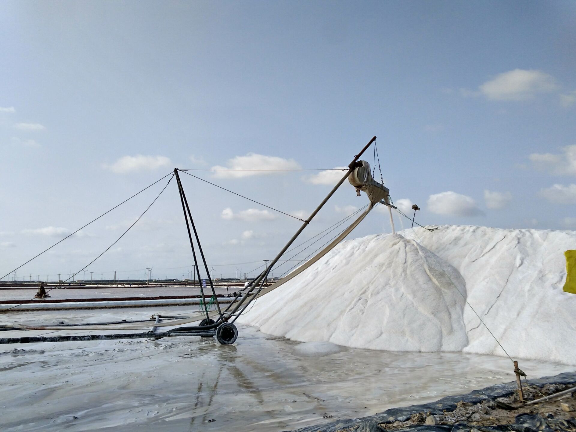 10月6日,在日曬制鹽新河分公司十班,幾名鹽工在不遠處鹽池內整理扒過鹽的格塊,一臺唐三零機械正在最后一塊鹽池內緩緩移動集鹽,鹽泵運轉不停,輸送鹽上廩,一條鹽廩即將筑成。在國慶假日期間,日曬制鹽公司值班人員不脫崗、生產經營不斷線、鹽業(yè)生產不停歇,入秋以來,已扒鹽5萬噸,為公司的國慶假日增添了道道靚麗的風景。