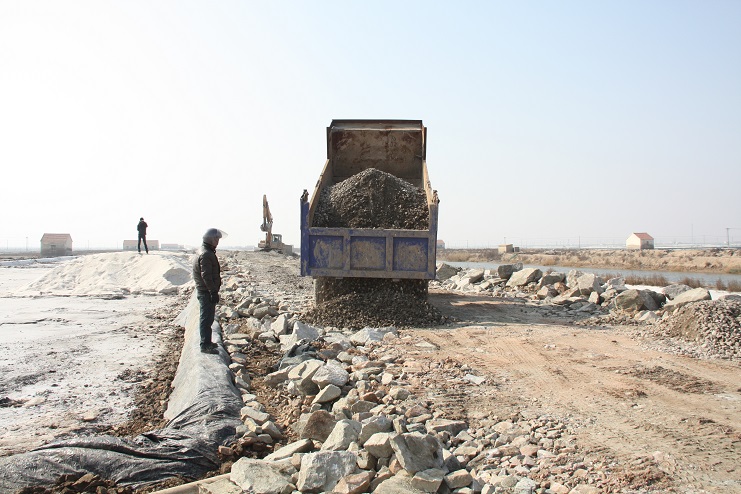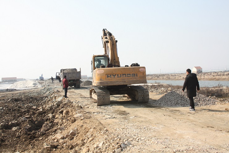 2月15日,在新河制鹽公司七至十班運(yùn)鹽路施工現(xiàn)場,我們看到南翼公司項目工程分公司的員工正在指揮兩臺小型工程車將石子傾倒在路基上,兩臺挖掘機(jī)正忙于將運(yùn)送來的石子整平。運(yùn)鹽河對面,三輛滿載土夾石的大型工程車一字排開,正等待卸載。據(jù)了解,目前正在施工的是新河制鹽分公司二期運(yùn)鹽路維修改造工程,該工程改造路段全長3300米,計劃總投資193萬元,其中路基鋪設(shè)部分由日曬制鹽公司出資45萬元,路面部分則由縣交通局承擔(dān),預(yù)計需要投入148萬元。該工程于去年底開始施工,預(yù)計三月中下旬全部鋪設(shè)完成。另外新河制鹽分公司一期一至十二班3300米運(yùn)鹽路改造工程計劃將于今年下半年實施。