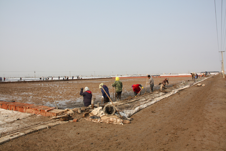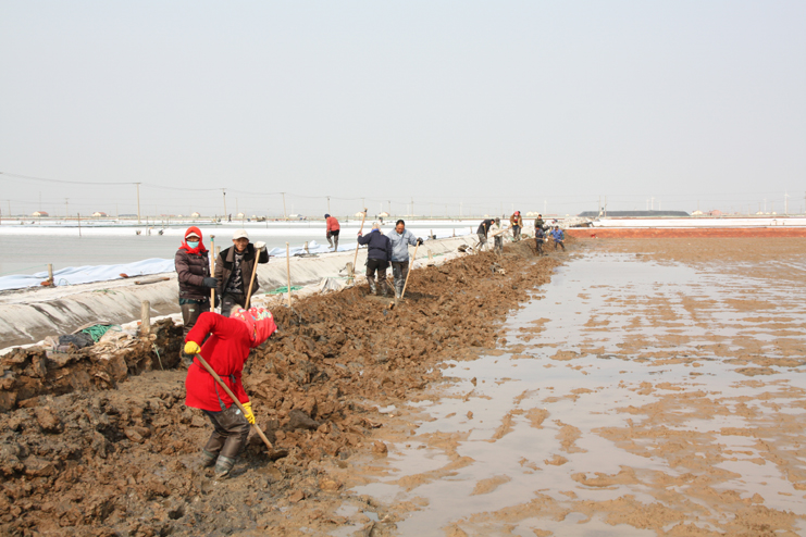 3月21日,在新河制鹽分公司八班的一期結晶區(qū),一片火熱景象,只見大家正在灘內揮膀大干,挖泥的、和泥的、打堰的,配合密切,運作熟練,參加勞動的職工足有50余人。“為了加快食用原料海鹽基地建設進度,今天,我們集中了7個組班的員工幫助八班維修下馬格格堰,爭取早日灌池生產。”正在工作現(xiàn)場安排工作的該公司經理安樹林說道。