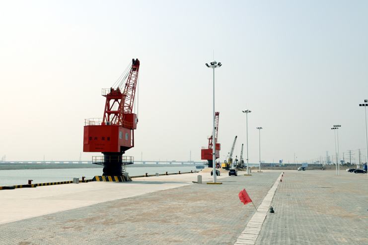 在五灌河碼頭現(xiàn)場(chǎng),302米長(zhǎng)的碼頭平臺(tái)上,2座20多米高的紅色座吊一字排開,在河水的映照下顯得格外“威武”。據(jù)碼頭工作人員介紹,這兩座吊機(jī)剛剛安裝并調(diào)試完畢,它們是五灌河碼頭運(yùn)營(yíng)的最基本條件之一,一座25噸,另一座40噸,運(yùn)出貨物將通過(guò)這兩座吊機(jī)完成。