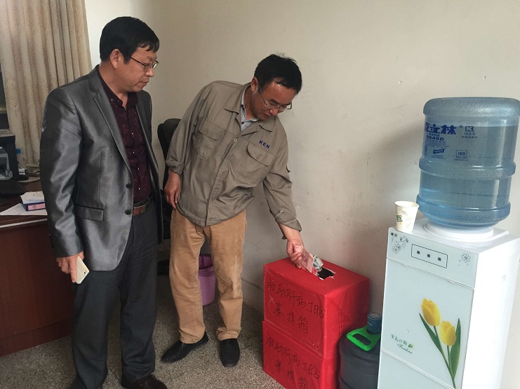6月1日下午,新河分會(huì)主任帶著一百余名員工的委托,鄭重地將籌集上來(lái)的愛(ài)心款投入捐款箱中。(新河制鹽程龍)