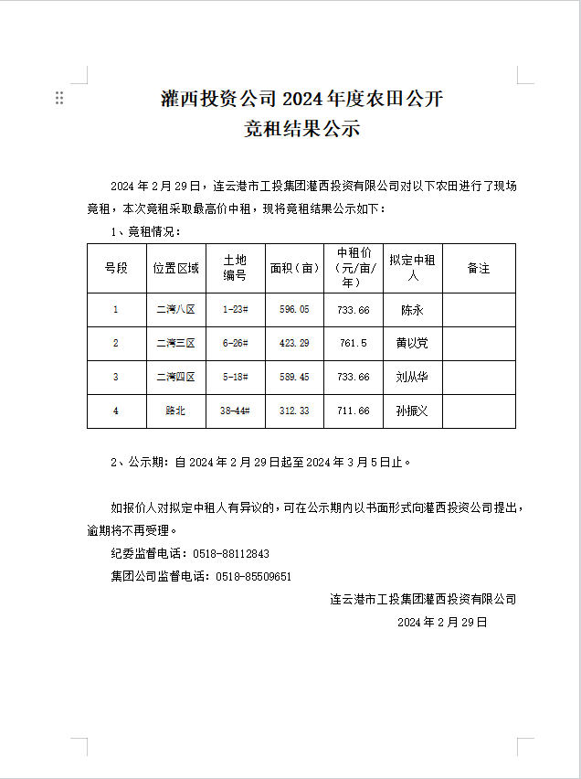 灌西投資公司2024年度農(nóng)田公開競租結(jié)果公示