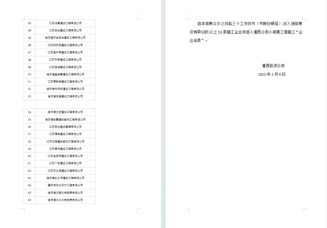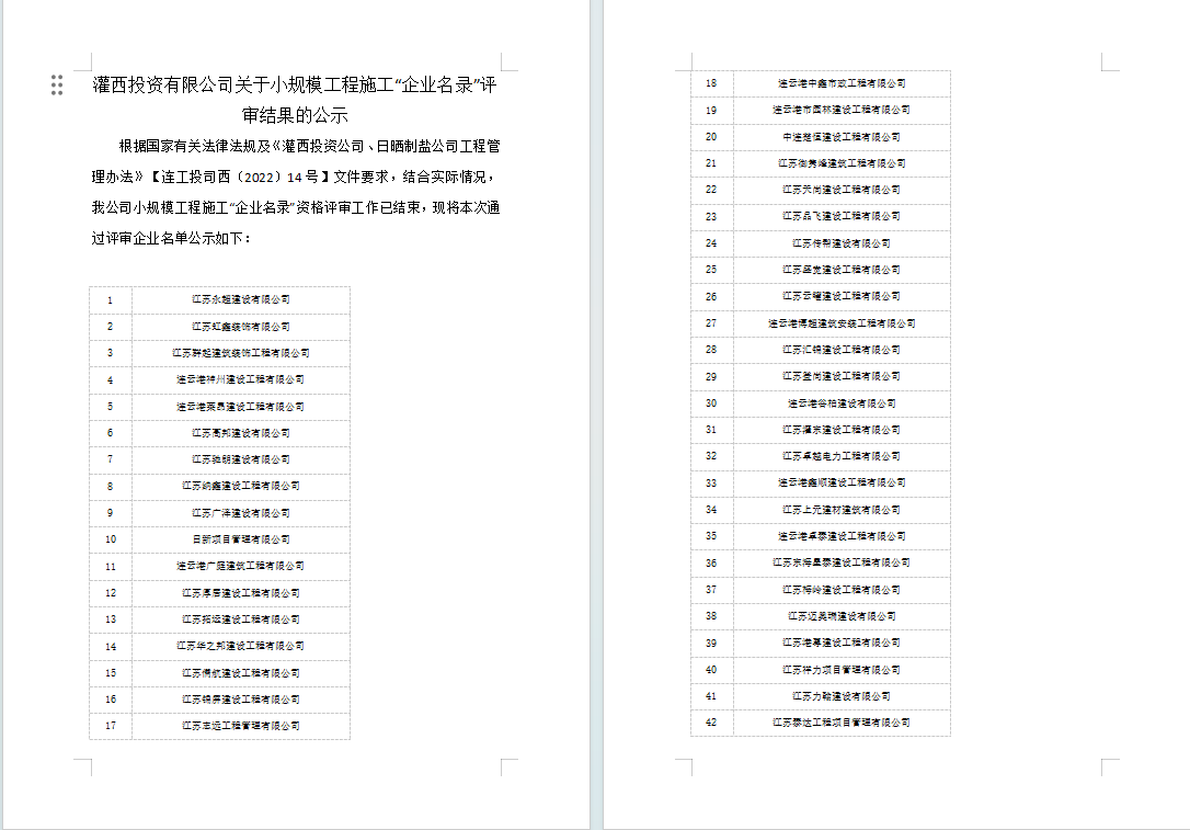 灌西投資有限公司關(guān)于小規(guī)模工程施工“企業(yè)名錄”評審結(jié)果的公示