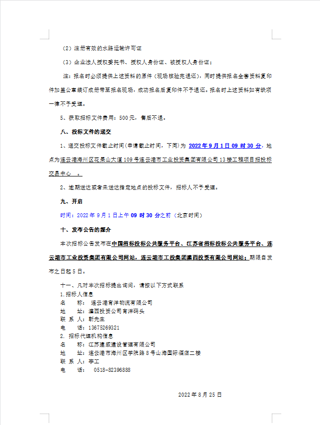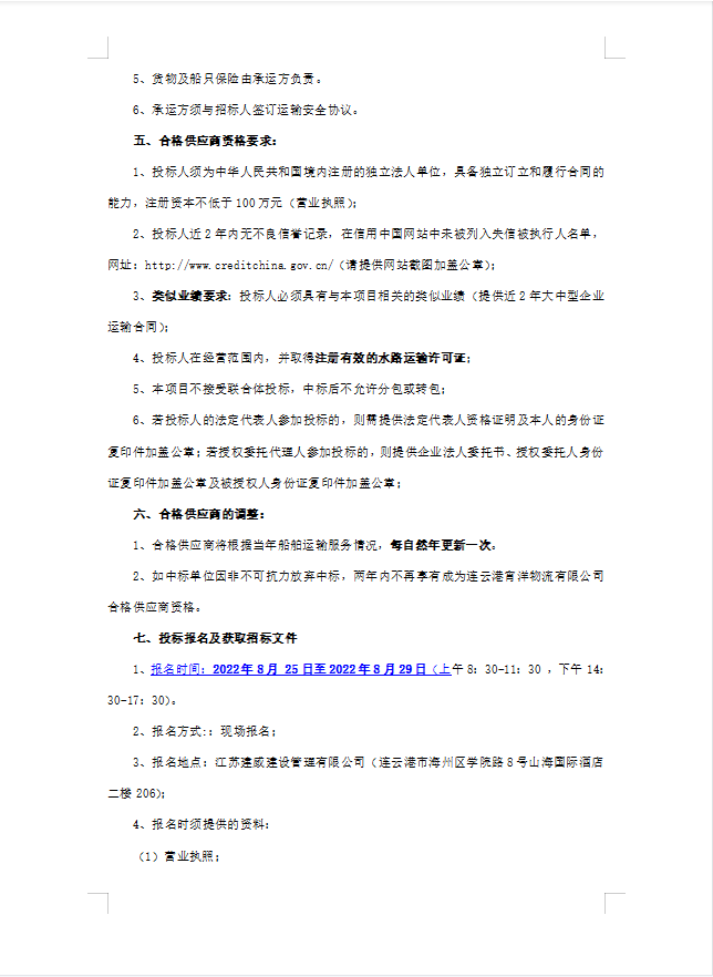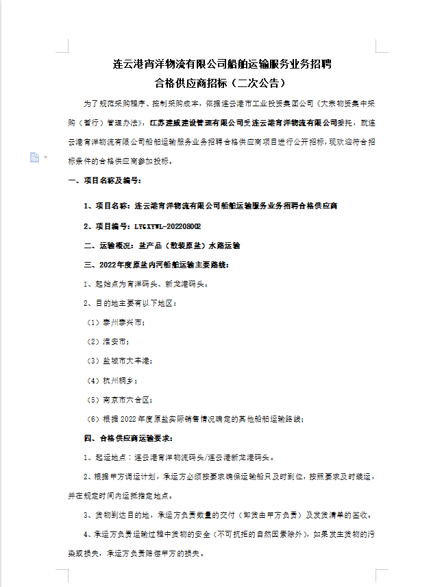 連云港宵洋物流有限公司船舶運輸服務(wù)業(yè)務(wù)招聘合格供應商招標(二次公告)
