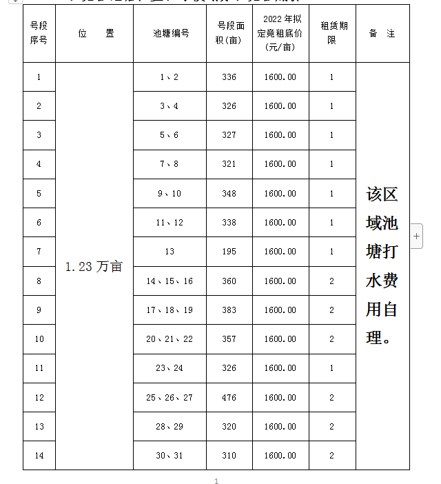 一、競租池塘位置、號段劃分、競租底價