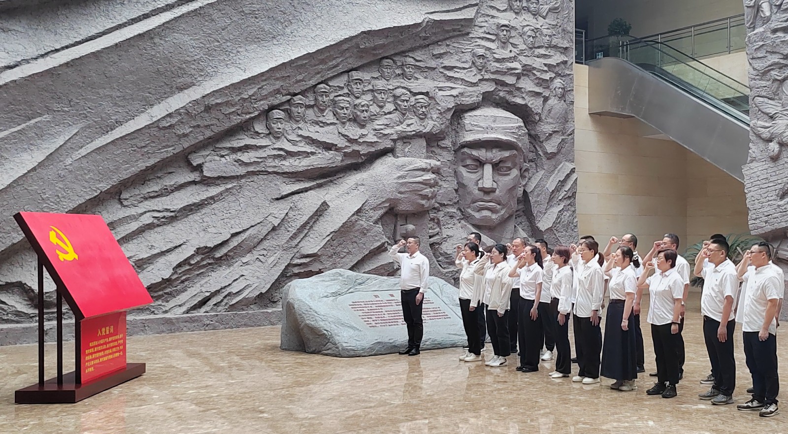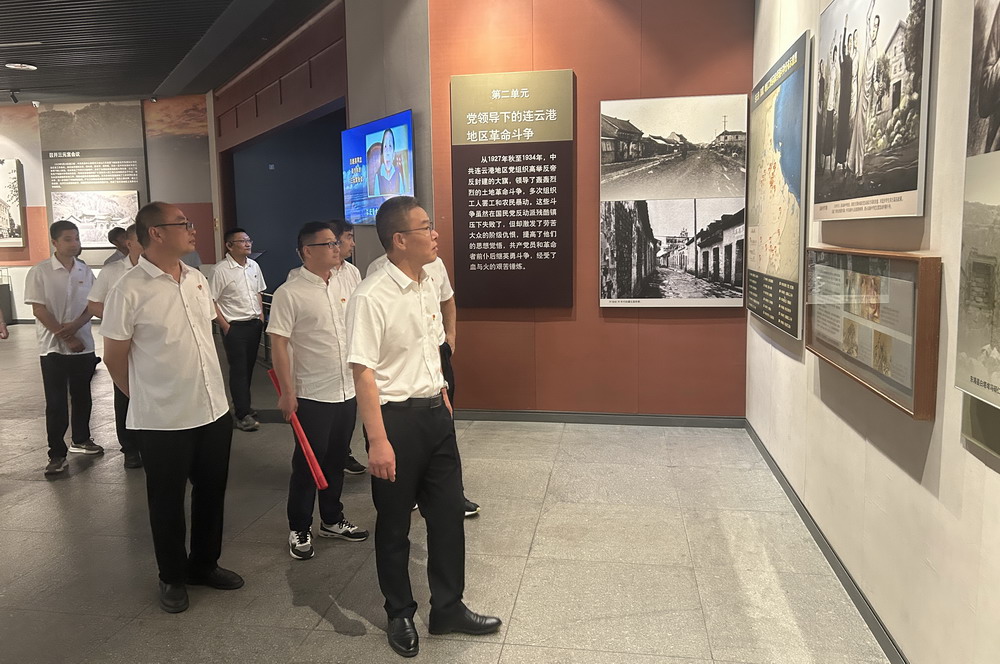在連云港市革命博物館莊嚴(yán)肅穆的展廳內(nèi),大家認(rèn)真聆聽講解員講述連云港地區(qū)的革命斗爭史。一件件珍貴的歷史文物、一幅幅生動(dòng)的歷史照片,再現(xiàn)了革命先烈們?yōu)槊褡褰夥攀聵I(yè)英勇奮斗的光輝歷程。在革命烈士浮雕前,全體黨員整齊列隊(duì),重溫入黨誓詞,強(qiáng)化政治信仰,增強(qiáng)責(zé)任擔(dān)當(dāng)。