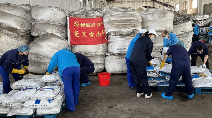 6月6日-6月7日,我公司黨委開展“我為黨旗增光添彩”志愿服務(wù)活動(dòng)。機(jī)關(guān)支部共30名黨員協(xié)助車間整理庫房,共整理成品鹽130余噸?;顒?dòng)的開展進(jìn)一步發(fā)揮了“兩個(gè)作用”,積極踐行了志愿服務(wù)精神,為車間一線辦實(shí)事、解難題。(金宣)