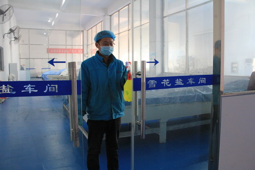 雪花鹽車間主任助理萬平正在對車間關(guān)鍵區(qū)域進行消毒。