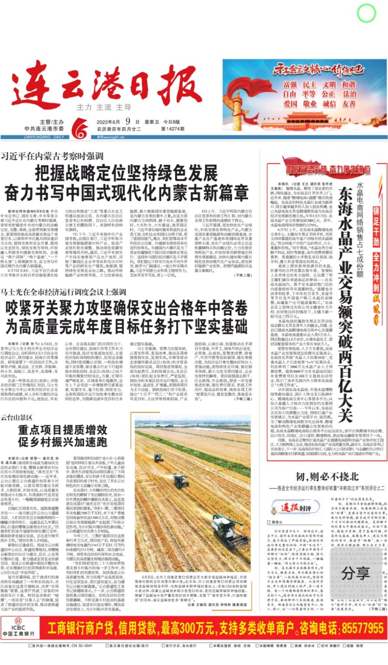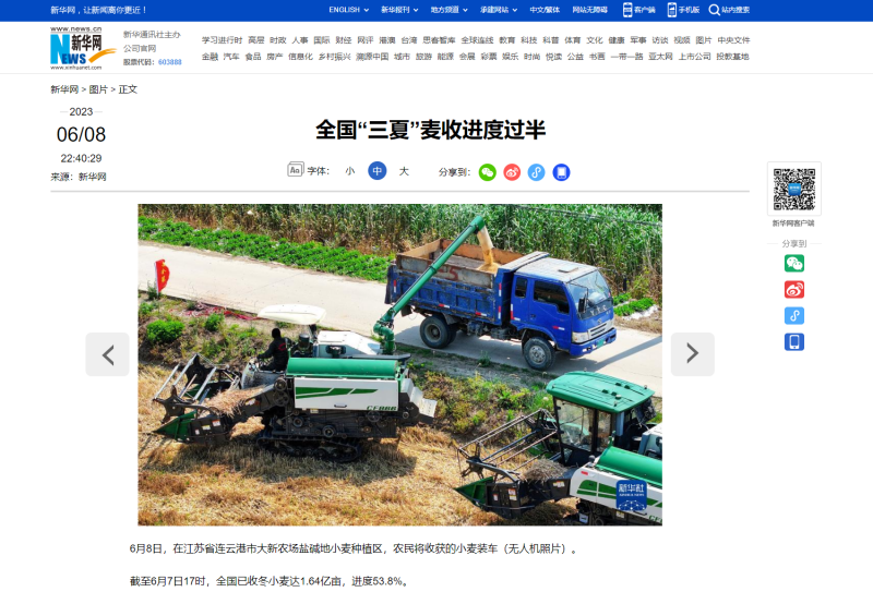 自6月8日麥收工作啟動以來,青口投資公司高度重視、精心組織,科學高效調動全方面因素,全力投入耐鹽堿小麥收割工作,開創(chuàng)了農(nóng)業(yè)高質發(fā)展新局面,受到了中國政府網(wǎng)、人民網(wǎng)、新華社、新華網(wǎng)、連云港日報、蒼梧晚報等中央、省市級主流媒體的廣泛關注。(青 宣)