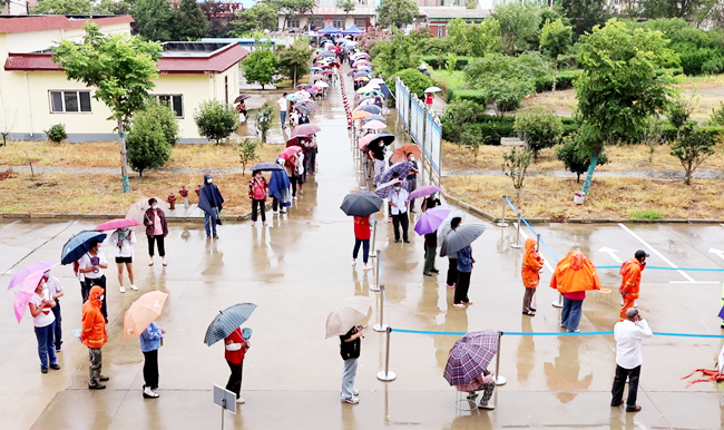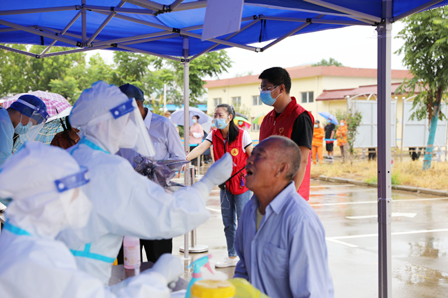 “黨旗飄在一線、堡壘筑在一線、黨員沖在一線”。核酸檢測(cè)現(xiàn)場(chǎng),來自青口公司黨員志愿者在現(xiàn)場(chǎng)為職工群眾提供相關(guān)咨詢和掃碼指導(dǎo)服務(wù),很多黨員在核檢工作中全身濕透仍在雨中盡力維護(hù)秩序,盡管天氣不作美,但是職工群眾依然按工作人員的指導(dǎo)有序地進(jìn)行核酸檢測(cè)。大雨里,黨員紅、醫(yī)護(hù)白顯得格外耀眼。(仲偉彬)