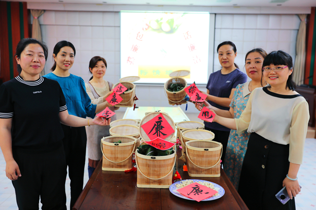 在活動(dòng)現(xiàn)場(chǎng),桌子上擺滿了碧青粽葉、黑白糯米、紅豆大棗、白色蓮子,烘托出濃厚的節(jié)日氣氛。大家歡聚一堂、歡聲笑語(yǔ),在傳統(tǒng)文化中感受廉潔元素,一邊聊著家常,一邊包著粽子,先是選好“青”廉衣,然后放入提前泡好的 “蓮”心餡,最后系緊“廉潔繩”,不一會(huì),一個(gè)個(gè)碧綠飄香、形狀各異“廉心粽”就包好了,被整齊地?cái)[放在竹籃中。紀(jì)委書記朱文兵說(shuō):“廉心粽蘊(yùn)含著清正廉潔的美好寓意,組織大家親手包廉粽,是希望大家能夠把‘廉’帶回家,在品嘗美味廉粽的同時(shí),還要時(shí)刻繃緊廉潔弦,做到守廉潔、過(guò)廉節(jié)”。