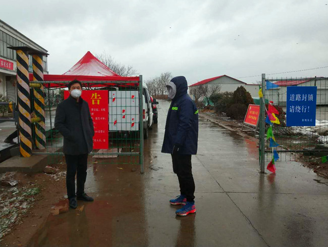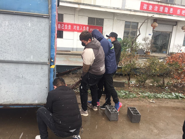 公司黨委書記、董事長胡傳法冒雪檢查成業(yè)飼料卡口,胡書記囑咐在現(xiàn)場值班的團青干部防控一線,要動真格不能含糊,堅決不給外來車輛通過。負(fù)責(zé)這里還有生產(chǎn)生活服務(wù)中心和黃沙分場的全體管理干部,大家都很辛苦,但沒有埋怨,都在默默地堅守崗位,履行職責(zé)。“你不站崗我不站崗,誰保衛(wèi)咱大場”他們是這樣說也是這樣做的。為了讓值守人員有一個溫暖的臨時休憩的場所,泰祥公司將一個臨時集裝箱拉到卡口,后勤班的小伙子們,搬運調(diào)試固定,絲毫沒有因為寒冷的天氣影響工作進度。