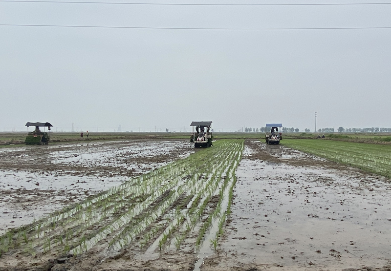 走進(jìn)大新農(nóng)場田間地頭,伴隨著機(jī)械轟鳴聲,插秧機(jī)往來穿梭,一株株嫩綠的秧苗在插秧機(jī)苗盤上滑落,整齊地插入水田里。