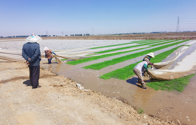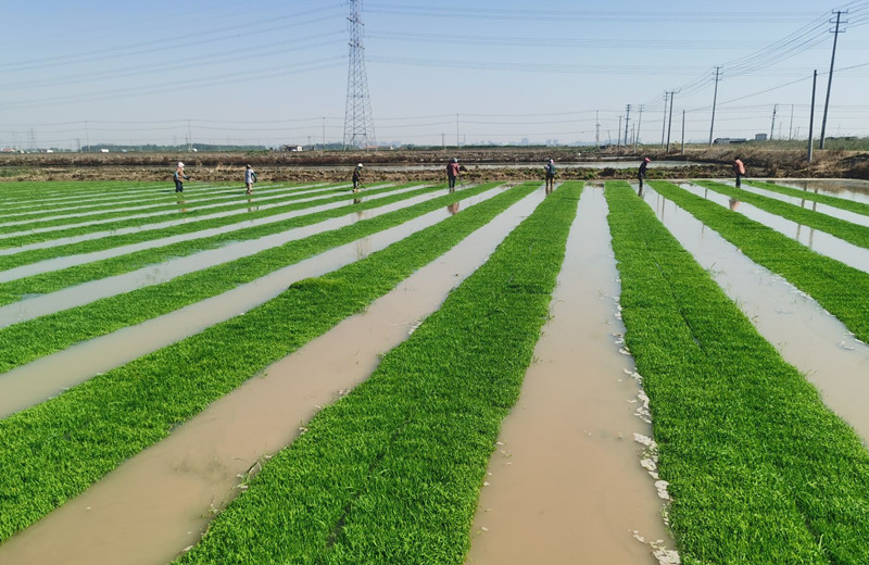 近日,大新農(nóng)場自營農(nóng)田機插秧苗已全部揭開無紡布,秧苗整體長勢較好,一片綠意盎然。目前播種較早的秧苗苗齡在三葉一心。(劉 楊)
