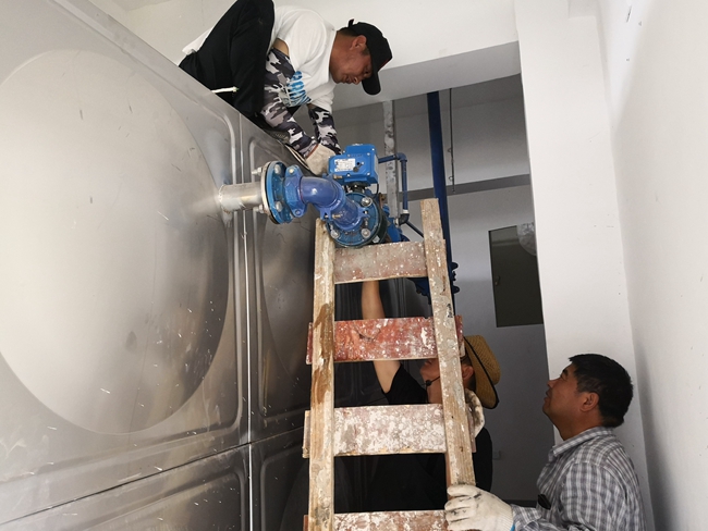 搶修現(xiàn)場,工作人員經(jīng)過仔細勘察,并通過自動供水配電柜的各項數(shù)據(jù)逐一排查,最終確定為進水水力閥銹蝕損壞,失去水箱滿水時自動停水的功能,造成水箱溢水現(xiàn)象發(fā)生。由于泵房內(nèi)維修空間狹小,操作有一定難度,為了保證居民生活用水不受影響,自來水班組 想方設法,一方面安排專職人員現(xiàn)場監(jiān)督安全,另一方面,安排熟練的操作工 在狹小的空間里半蹲著操作維修,甚至 還要進入水箱內(nèi)更換配件,拆除壞閥門、連接管道、加裝防漏水皮墊、擰緊螺絲等多道工序順利完成 。經(jīng)過近 3小時的奮力苦干,終于搶修完畢,恢復正常供水,有力的保證了小區(qū)居民的生活用水。 (張根玲)