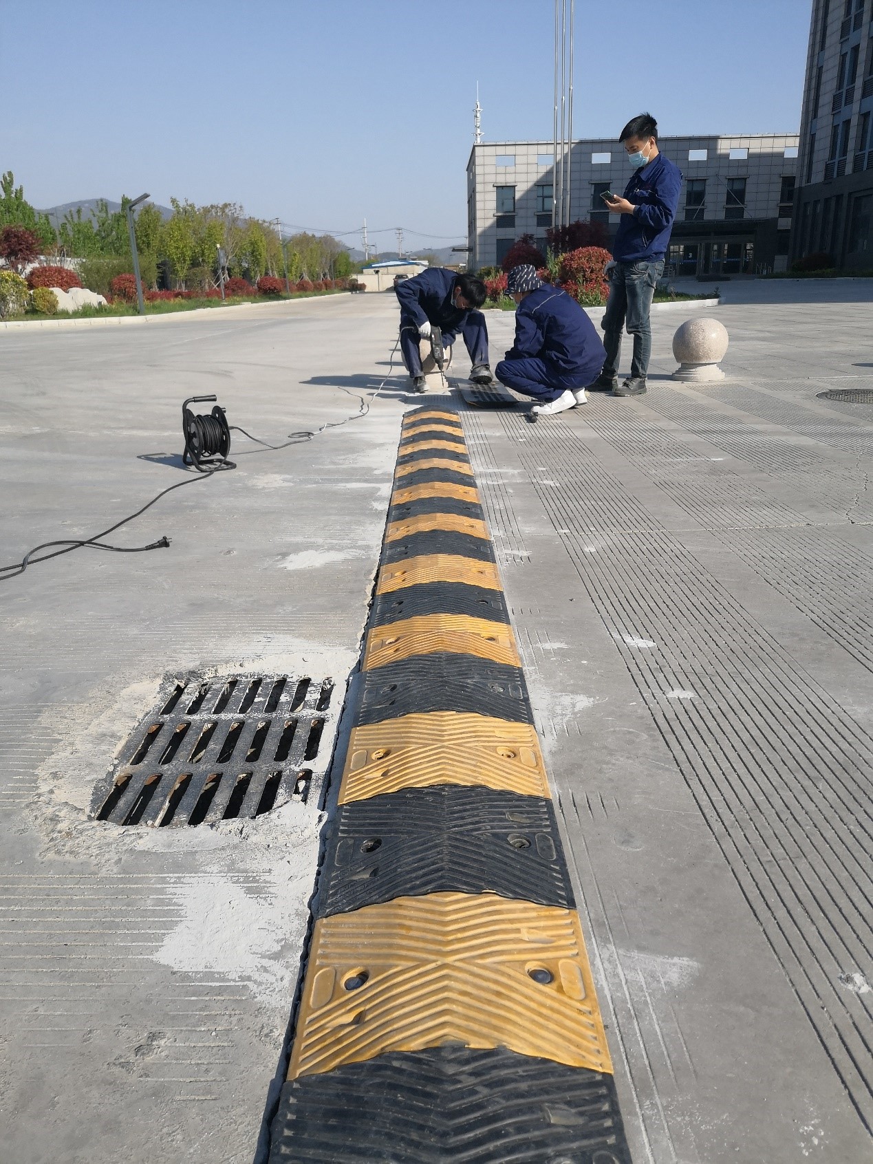 為了強(qiáng)化道路交通安全,公司在廠(chǎng)區(qū)主大門(mén)入口和停車(chē)場(chǎng)兩處加設(shè)減速帶。圖為安全管理部員工在現(xiàn)場(chǎng)施工。 (安全管理部)