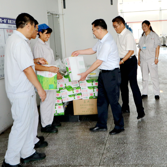 8月1日上午,集團(tuán)公司黨委副書(shū)記戴鴻鳴、工會(huì)主席劉承志來(lái)我公司慰問(wèn)生產(chǎn)一線員工,為辛勤工作的員工送來(lái)牛奶、綠豆等防暑降溫慰問(wèn)品。公司黨支部書(shū)記、副董事長(zhǎng)鄒德兵,總經(jīng)理韓立新等多位領(lǐng)導(dǎo)陪同。