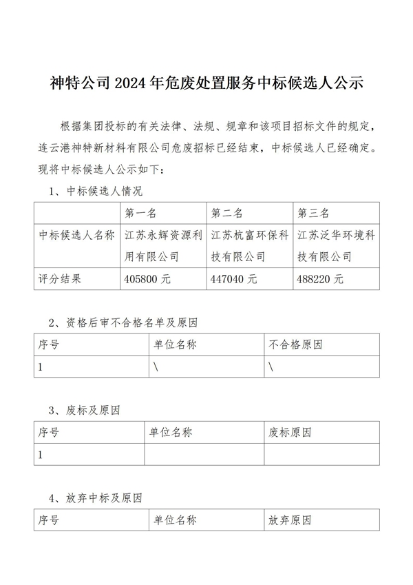 神特公司2024年危廢處置服務(wù)中標(biāo)候選人公示