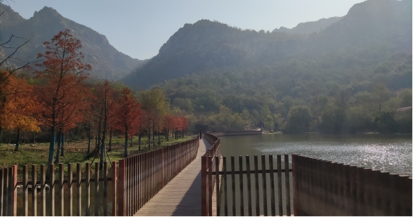斗轉(zhuǎn)星移,山河已變,五百年前詩(shī)人所描述的風(fēng)景我們無(wú)法再欣賞到,但是現(xiàn)在的園林水庫(kù)更有一番風(fēng)采?;鸺t的水杉是她最引人注目的特色之一,寒風(fēng)掠過(guò),水杉的葉子也逐漸變成了鮮艷的火紅色,猶如一片片燃燒的火焰,在寒冷的季節(jié)中增添了一抹暖色。徜徉于火紅的水杉林,陽(yáng)光下樹(shù)影婆娑,寧?kù)o,安逸,沉醉于詩(shī)畫中。波光粼粼的湖水更是一幅美妙的畫卷,清澈透明,水草搖曳,微波蕩漾,游魚(yú)穿梭,仿佛寒冷與它們無(wú)關(guān)。棧橋嫻熟地穿越著園林與水庫(kù),一直連接到山腳,行走其上,腳下水光瀲滟,眼前層林盡染,晴空之下無(wú)一絲塵埃,啾啾鳥(niǎo)鳴,沙沙葉響,嘩嘩水流,大自然的樂(lè)章歡快靜謐。