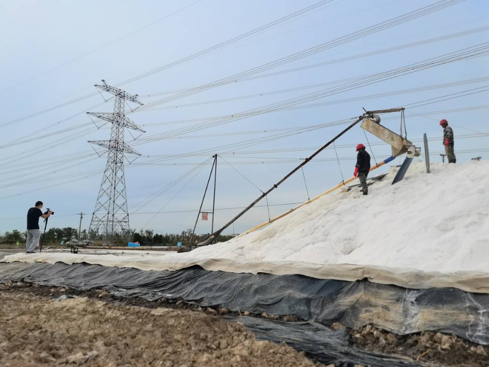 九月的鹽場(chǎng),鹽田銀光閃閃,高壓電線凌空飛架,水泵房池星羅棋布,制鹽機(jī)械轉(zhuǎn)動(dòng)轟鳴,一座座白花花、明晃晃的鹽廩,遠(yuǎn)看有如干凈、潔白的雪山,景象十分美麗。9月27日,連云港日?qǐng)?bào)社新媒體中心采訪組一行,來(lái)到臺(tái)北海州灣公司制鹽現(xiàn)場(chǎng),進(jìn)行“奮斗十年,難忘一刻”喜迎二十大專題欄目的拍攝,投資公司黨委書記、董事長(zhǎng)、總經(jīng)理王德志陪同。