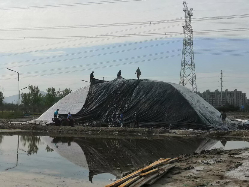 第一片180公畝的曬鹽池已經收鹽完畢,工人師傅們嫻熟有序用塑布對鹽廩進行覆蓋,預防雨水造成鹽斤淌化。