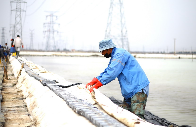 ? ? ? ??首先來到海州灣公司大浦班組。這里是公司礦鹵復(fù)產(chǎn)工作重點(diǎn)班組,職工們正在整理結(jié)晶池、搶修塑苫布。據(jù)海州灣公司負(fù)責(zé)人劉天義現(xiàn)場(chǎng)介紹,由于前期審批、采購(gòu)等原因,加之突發(fā)的新冠肺炎疫情,結(jié)晶池塑苫布沒能及時(shí)更新,預(yù)報(bào)25日有明顯降雨過程,海州灣廣大職工因地制宜,收舊利廢,積極備戰(zhàn)大雨天時(shí)。