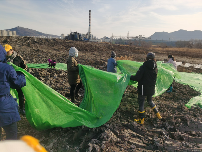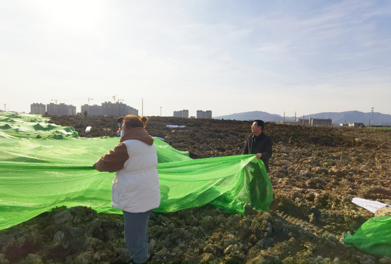 寒冷絲毫沒有降低大家的熱情,路面因為每天噴灑防塵導致潮濕泥濘,大家穿上雨靴,爬上爬下,一鼓作氣,經過兩天齊心協(xié)力的辛勤勞作,防塵網終于覆蓋完畢。遠遠望去,覆蓋綠網后的區(qū)域如同覆蓋了一片綠色植被。此次綠網覆蓋行動,不僅抑制了二次揚塵污染環(huán)境,保護了生態(tài)環(huán)境,同時達到了環(huán)境美化的效果。