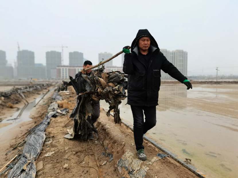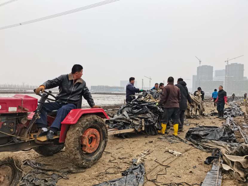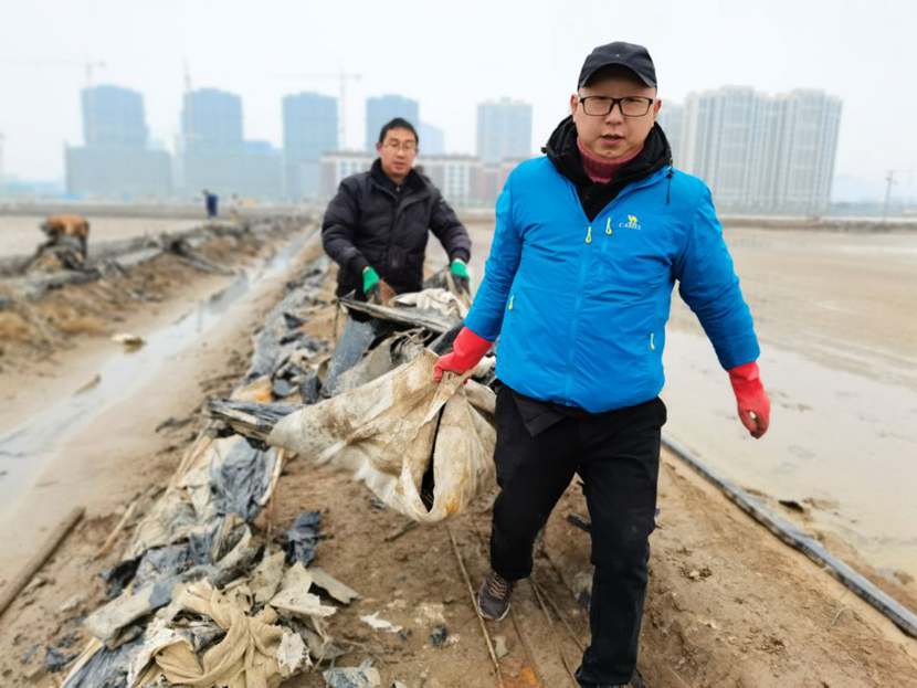 1月10日下午,第一批馳援隊伍——翔立分公司黨員突擊隊到達先鋒班組,結合海州灣公司黨員突擊隊共30余名隊員,穿戴好工作服、水鞋,兩人一組,三人一隊,雙肩挑,三人抬,緊張有序地清理生產現(xiàn)場拆除下來的廢棄的塑布、鋼絲等雜物。