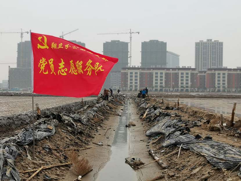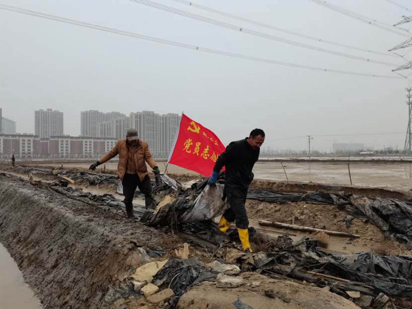 勞動現(xiàn)場,鮮紅的“黨員突擊隊”旗幟迎風飄揚,凜冽的寒風夾雜著細雨,絲毫不減大家的勞動熱情,個個汗流浹背、滿身泥漿,不怕臟不怕累,經過3個小時的突擊勞動,共清理1200米、16車池埝垃圾。