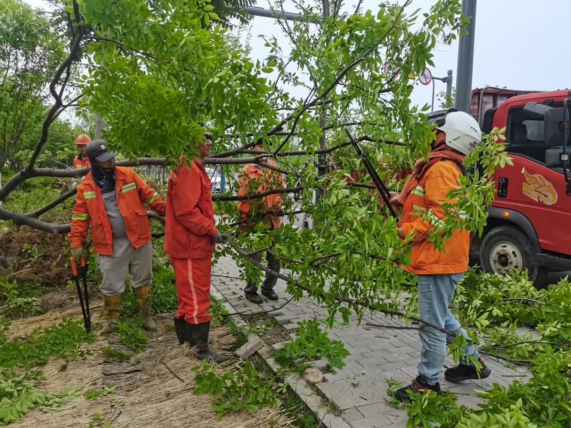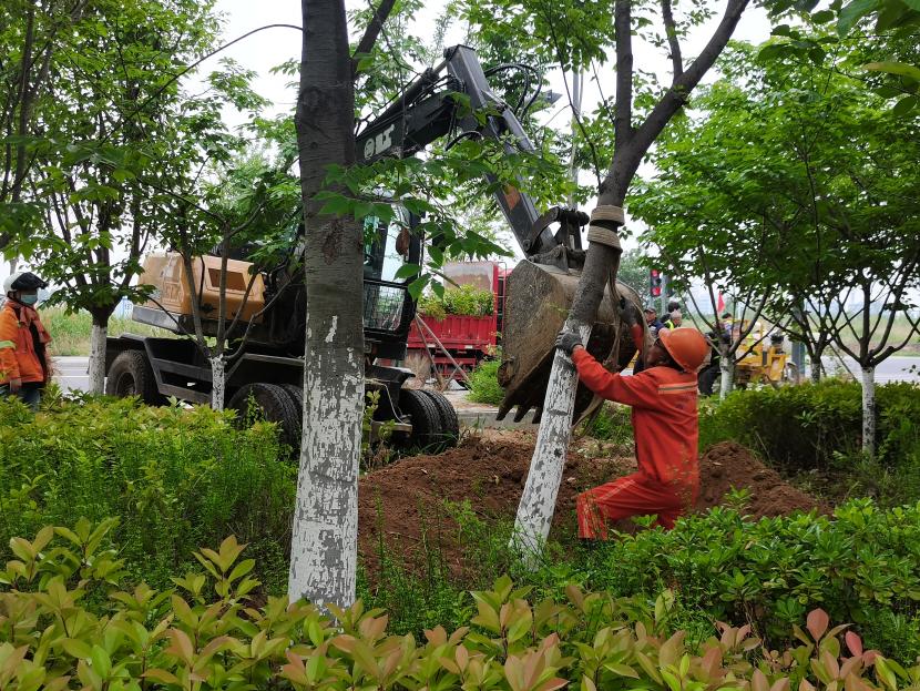 “吊裝準(zhǔn)備!”孫銀一聲令下,同時輔以手勢示意。挖掘機小臂緩緩升起,掛著土球的櫸樹在空中劃出一道道優(yōu)美的弧線。與此同時,路邊的綠化工人們迅速行動,進行剪枝、包扎根系等一系列熟練操作。晨光中,身著橙色工裝的工人們與綠色的苗木交相輝映,構(gòu)成了一幅流動的風(fēng)景線。機械的轟鳴與人聲的呼喊相互呼應(yīng),共同譜寫了一曲特殊的勞動樂章。