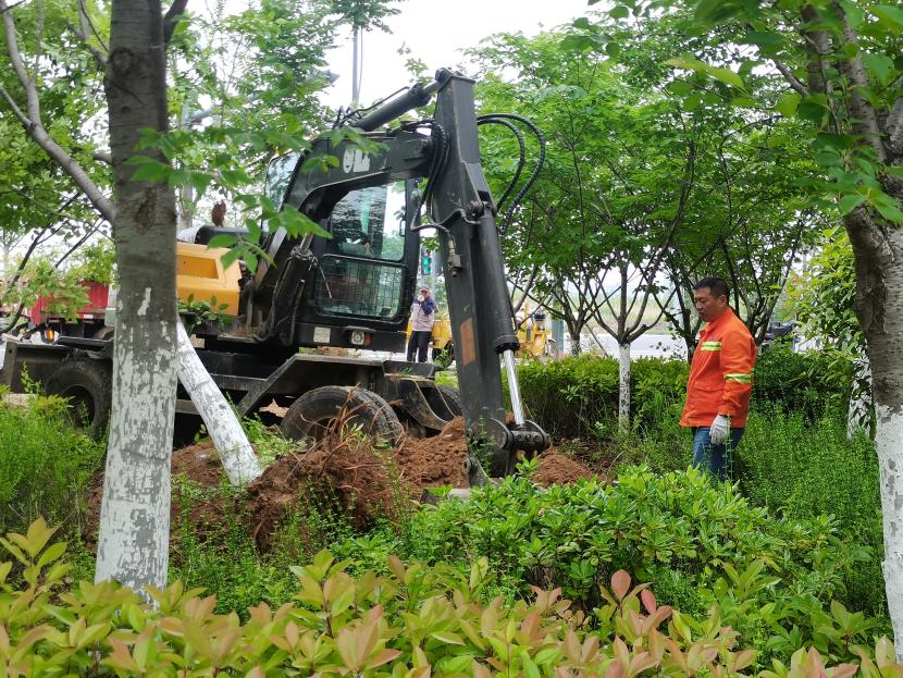 面對時間緊迫、任務(wù)繁重的情況,綠地片區(qū)承包人孫銀身先士卒,他給自己設(shè)定的是所有作業(yè)需在當(dāng)日午高峰前完成。伴隨著挖掘機的第一聲轟鳴,一場與時間賽跑的苗木遷移攻堅戰(zhàn)正式打響。