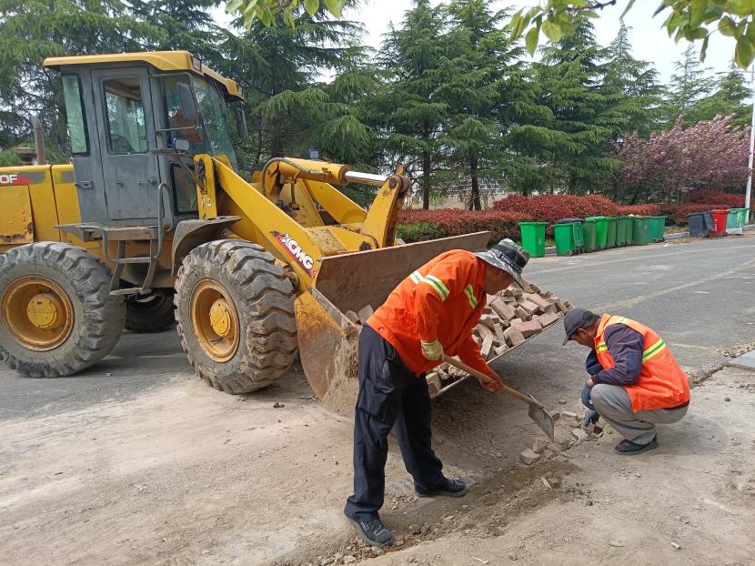 項目開工前,盛達市政分公司召開中科院提升改造專項會議,根據(jù)各單項工程落實安全生產(chǎn)責(zé)任制,分班組劃片區(qū),并對隱蔽工程、交叉作業(yè)項目制定專項施工方案。該項目工期僅 30 天,由于工期緊,任務(wù)重,施工人員正在開足馬力搶時間、趕進度,在項目施工現(xiàn)場,原道磚清除、舊電纜拆除、新建道路基礎(chǔ)墊層、路牙石鋪設(shè)等各施工任務(wù)同步開展,挖掘機、裝載機、貨車等各種工程車輛有序穿梭,各施工現(xiàn)場圍擋、指示牌、路錐等擺放規(guī)范,人員工作服、安全帽等穿戴整齊,確保安全文明施工。