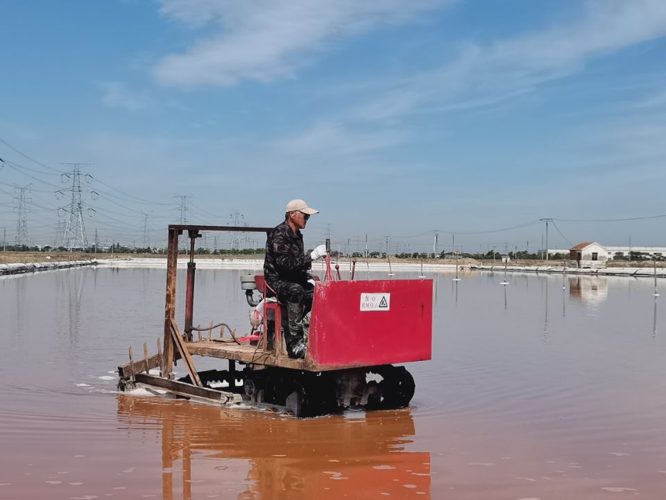 此時的鹽層大約已有五六厘米厚,若想長出晶瑩剔透的大顆粒晶體鹽,活碴作業(yè)是必不可少的。每日清晨6點,昌圩班組、先鋒班組、大浦班組準時有一名工人駕駛活碴機,對鹽池板進行破碎翻動,保持鹽層的疏松和顆粒間一定的間隙,確保晶體長得既快又好。通過活碴,鹽顆粒散亂在池底,經(jīng)過陽光照射會產(chǎn)生不規(guī)則的反射,大大減少了光線反射回水面的概率,易于提高鹵水溫度,增大鹵水蒸發(fā)量,從而增加原鹽的產(chǎn)量。