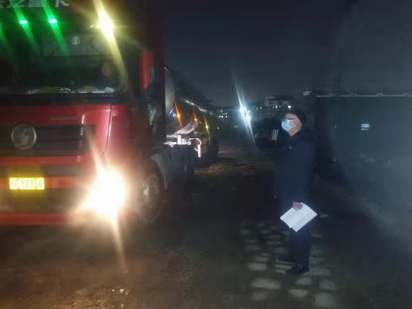 在登記信息的過程中,公司紀檢專員孫健細心的發(fā)現(xiàn)駕駛人員的不對勁,“師傅,您看起來很疲憊,是身體不舒服嗎?”“小伙子觀察真是細致,我只是太餓了,閉環(huán)管理規(guī)定駕駛員不準離車,所以我從鹽城出來4個多小時還沒有吃晚飯?!薄皫煾?,您稍等一下,我去給您買份快餐,再給您燒壺熱水!”當駕駛員吃完快餐,鈣液車也裝貨結束,此時已是晚上9點40分,按照“方案”規(guī)定,“大白”程輝對車輛進行離場消殺,并拍攝相應消殺照片,上傳系統(tǒng)。