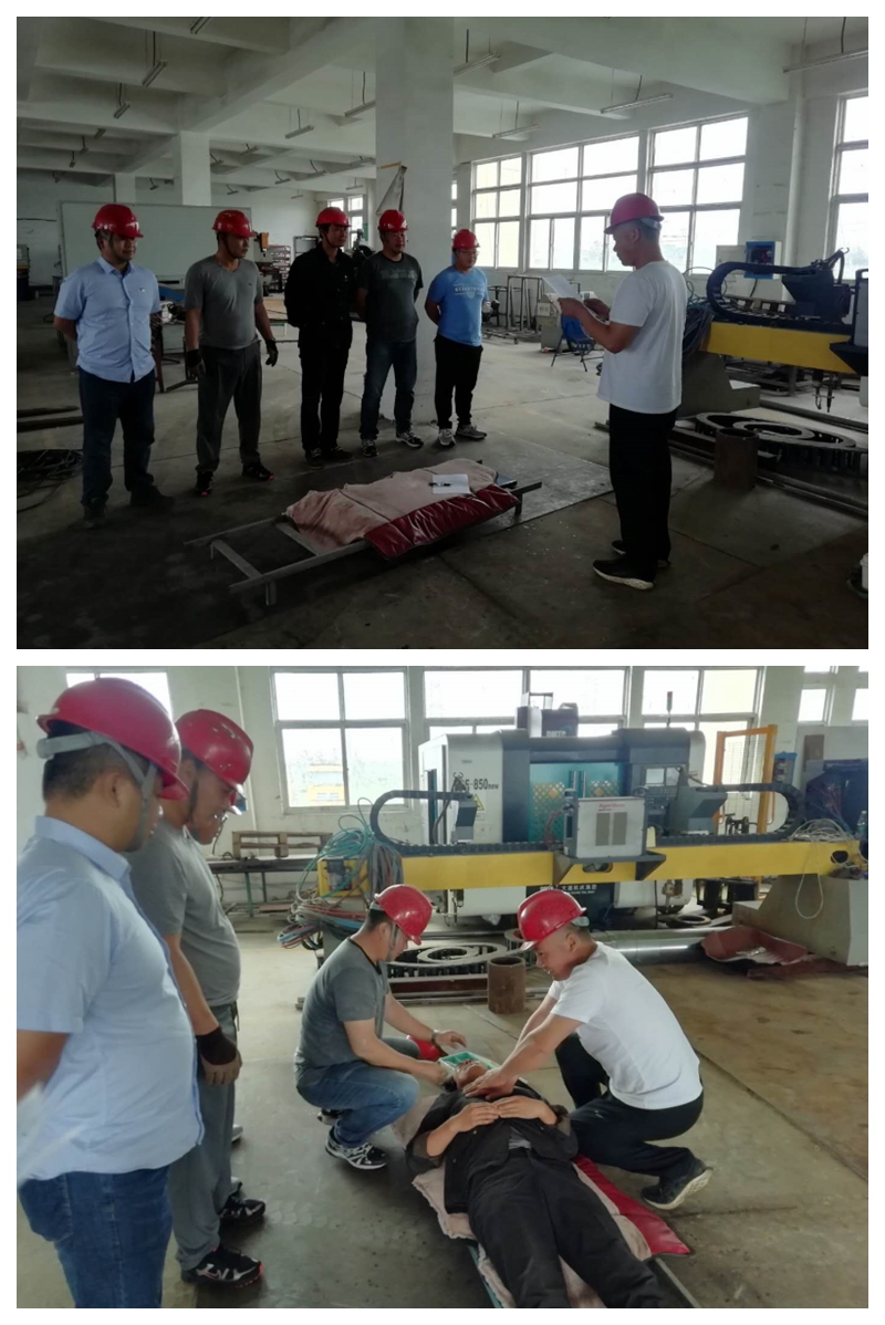 本次演練方案模擬在精工車間正常生產(chǎn)過程中,因?qū)﹄姎庠O(shè)備沒有經(jīng)常性檢查,液壓切板機(jī)切板時(shí)掉落的鋼板未采取防范措施將電氣電纜砸斷搭鐵,造成液壓切板機(jī)金屬外殼帶電,作業(yè)人員在正常操作機(jī)床時(shí)造成觸電事故傷害。當(dāng)同事發(fā)現(xiàn)有人觸電后,立刻做出救援反應(yīng),切斷電源將觸電人員安全隔離開后抬到擔(dān)架上進(jìn)行搶救。并同時(shí)上報(bào)應(yīng)救援指揮組,指揮組迅速做出響應(yīng),啟動(dòng)防觸電應(yīng)急預(yù)案,大家按應(yīng)急預(yù)案的分工迅速開展救援工作,撥打120急救電話、拉警戒線、查看傷情、緊急搶救、人工心肺復(fù)蘇等,直至觸電者蘇醒,在大家的共同協(xié)作下演練圓滿成功,翔立分公司湯占國總經(jīng)理對(duì)此次演練效果進(jìn)行了總結(jié)和點(diǎn)評(píng)。