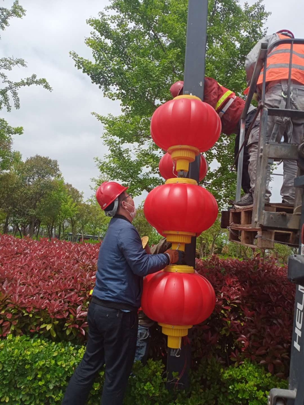 施工現(xiàn)場,大家配合默契利用小型叉車進(jìn)行輔助拆除作業(yè),五分鐘不用一個(gè)燈籠就拆除完成。這邊完成拆除部分,那邊負(fù)責(zé)還原以及運(yùn)送回收。由于燈籠的不可收攏性,同時(shí)為避免造成二次污染,對(duì)于拆下來的燈籠及時(shí)進(jìn)行運(yùn)送和回收保存,確保第二年要安裝的時(shí)候重復(fù)利用。